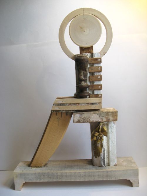 Опять отталкиваюсь от деталей, подобранных специально: токарные элементы – руки и лицо, с расчетом запаса прочности, несколько винтажных элементов с блошиного рынка и части венского стула. Массивный подиум, как обязательное условие – объект должен быть устойчивым, хотя и довольно тяжелым, к сожалению. Пластика лица: никаких мелких деталей делать не буду. Ограничусь исключительно зачесанным волосяным пробором.